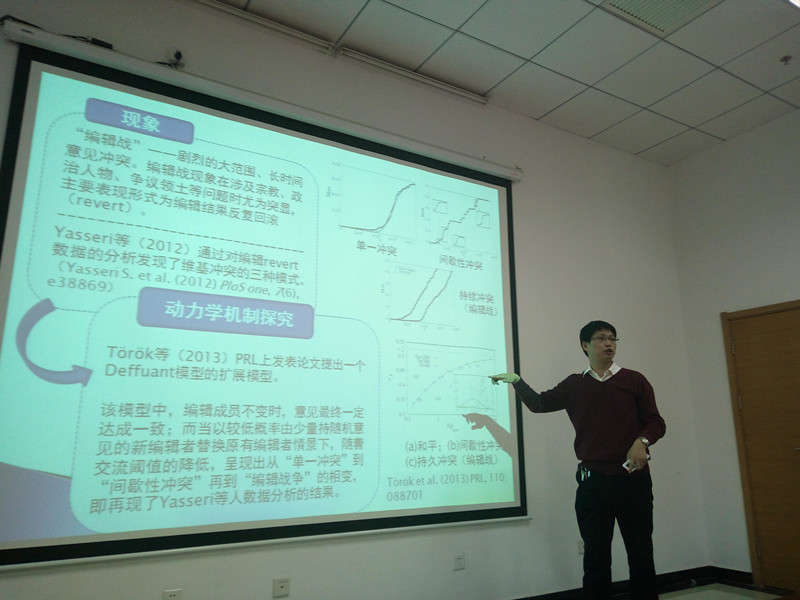 超过1个小时的报告中,夏老师解释了传播动力学和意见动力学的差异,介绍了基于复杂适应性系统研究路线结合一系列模型研究相关情景下的在传播与意见动力学机制上的一些研究结果。传播动力机制方面,基于美国学者Centola提出的“复杂感染”模式,考虑社会增强效应并讨论了基于不同类型网络中的“复杂感染”渐进过程。针对意见动力学模型,介绍了著名的Deffuant意见动力学模型以及考虑认知不协调下的共识过程。最后介绍了一个针对维基百科编辑中编辑冲突的情景的扩展Deffuant模型的研究,并在此基础上引入间歇性激活的狂热者考察维基百科编辑呈现的三种冲突模式及其相变过程。最后简要交流了后续研究的一些想法。