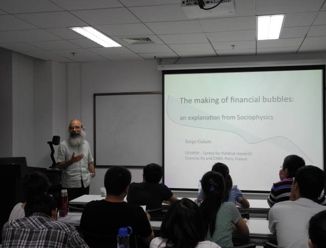 2014年6月10日下午法国国家科学研究中心(CNRS)资深研究员,社会物理学之父Serge Galam教授访问综合集成与知识科学小组,这是其第三次对综合集成小组的访问. 10日下午2:30-4:00,Galam教授在数学院南楼420会议室作了题为"Financial bubbles and opinion dynamics: a connexion from Sociophysics"的学术报告,展现了社会物理学在经济领域的应用价值。来自综合集成小组及系统所管理室、控制室及中科院软件所、自动化所等研究人员及研究生30余人参加了报告会,报告后踊跃提问,讨论热烈。