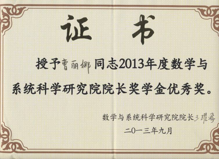 祝贺综合集成与知识科学小组成员曹丽娜同学光荣获得中科院数学与系统科学研究院第十一届院长奖学金优秀奖!